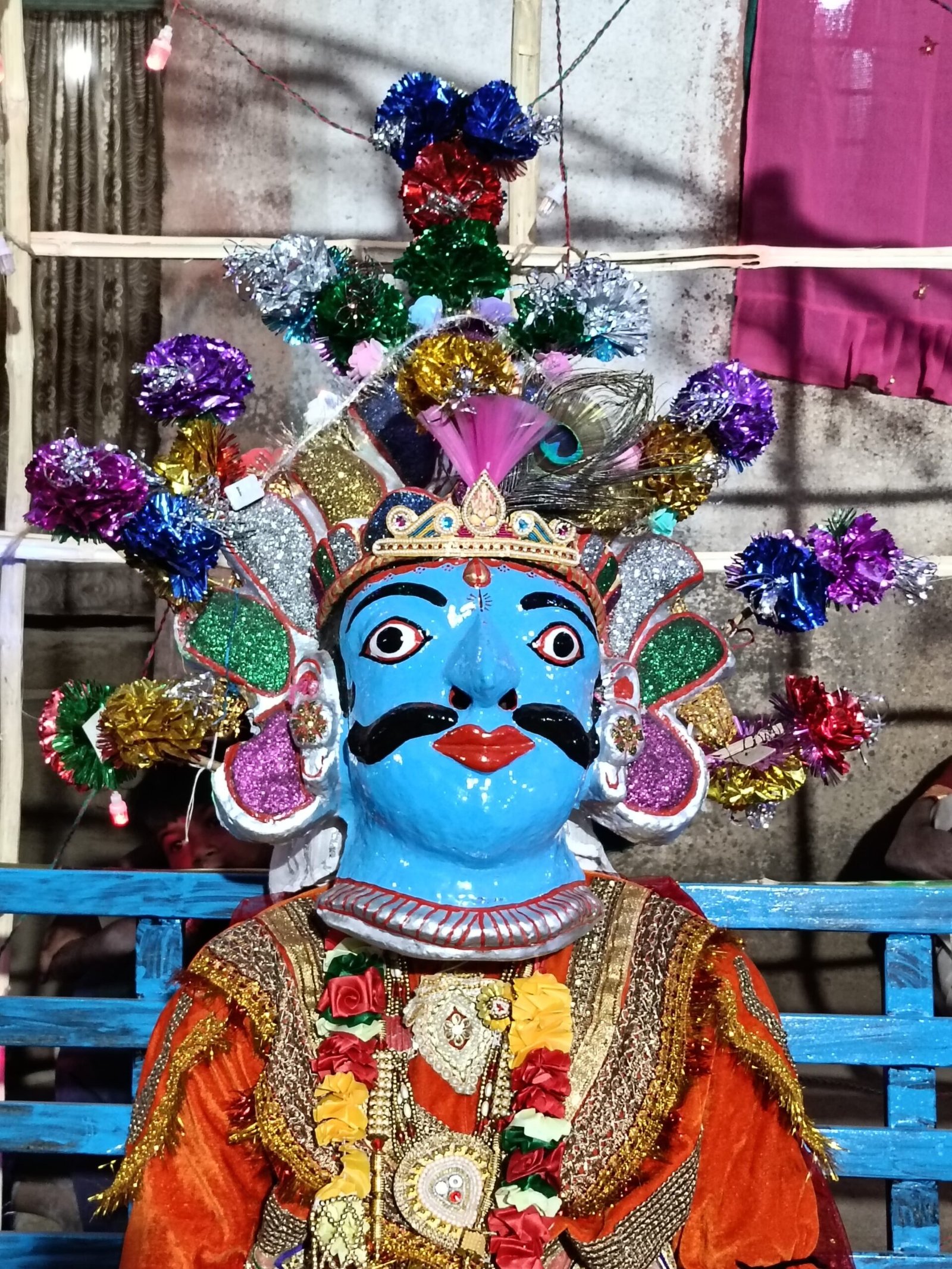 These paintings depicting the diverse aspects of everyday life form an integral part of religious rituals and marriage ceremonies. Triangular humans and animals with stick-like hands and legs and geometrical designs with rows of dots and dashes are drawn on the mud walls of the huts of the tribal. These paintings depict wedding scenes, various animals, birds, trees, men, women, children, descriptive harvest scenes, group of men and women dancing around a person playing Tarpa, dancing peacock, etc.